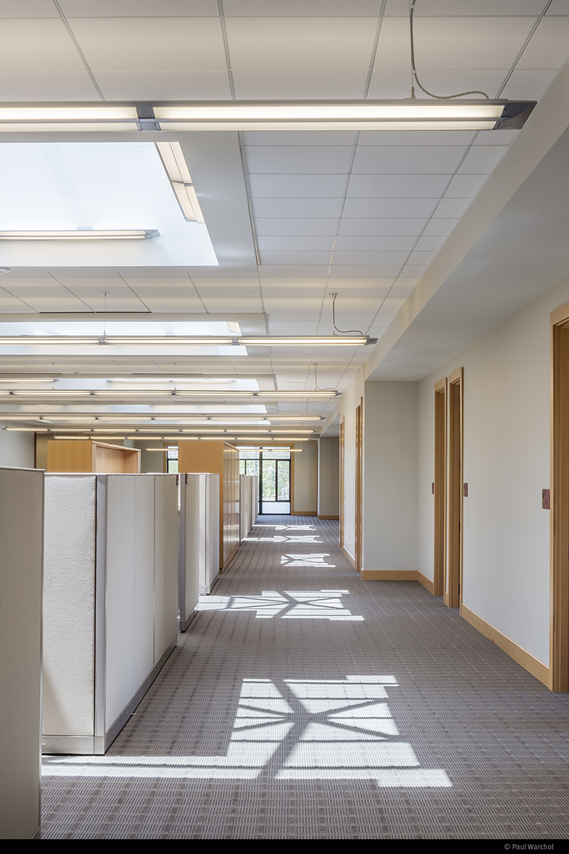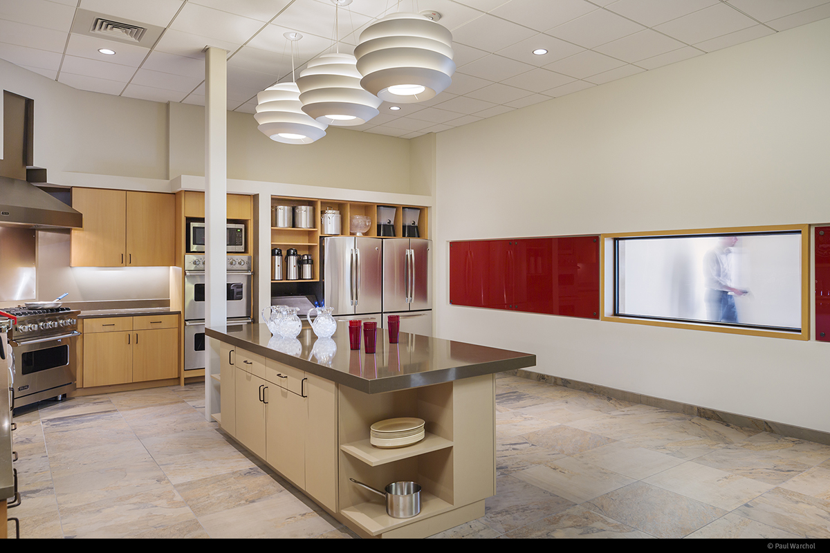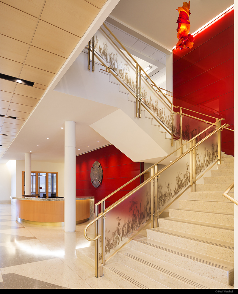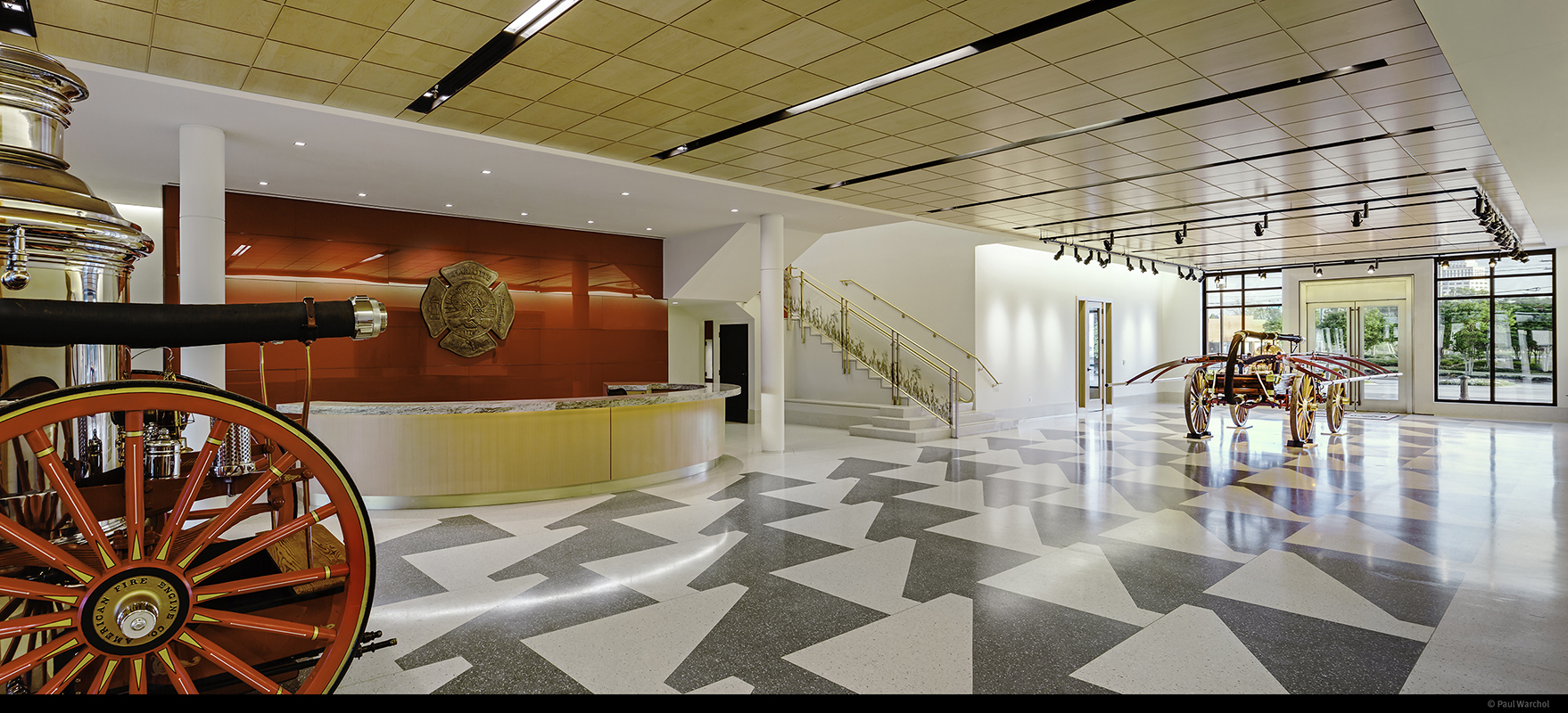 Designed for simple efficiency, diversity of function and flexibility, the interiors are characterized by a sense of open and inviting space, tall ceilings, abundant daylight (sky-lit on the upper office level), rich, warm and durable materials assembled with restrained playfulness in detail. All spaces along the exterior have operable windows for enjoyment of fresh air during mild weather. The large main lobby extending through the center of the ground floor and connecting both “Fronts” of the building serves as a public gathering and exhibit space for the department’s immaculately restored and maintained historic fire apparatus.