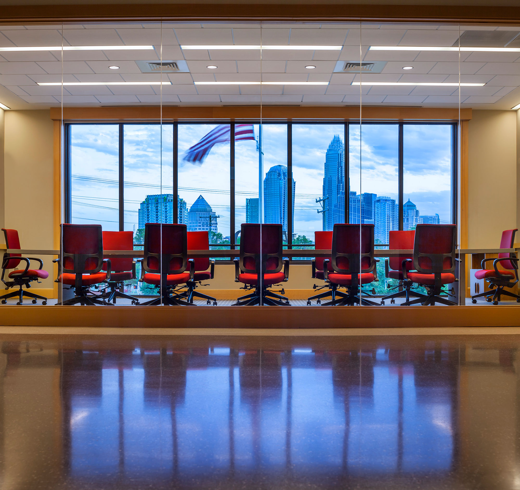 The unusual project site, defined by two converging thoroughfares forming a junction with a third cross street, commands a spectacular view of the uptown Charlotte skyline to the south. The siting of the headquarters building reflects a strong formality and order underpinning the project design. The client and design team understood from the beginning that the new headquarters was meant to become a symbolic Charlotte landmark. As such, it commands its site and immediate surroundings while visually connecting to the center city in the near distance.