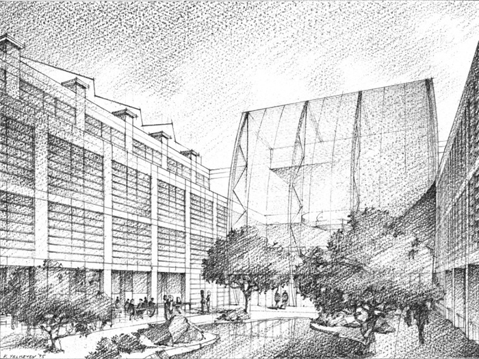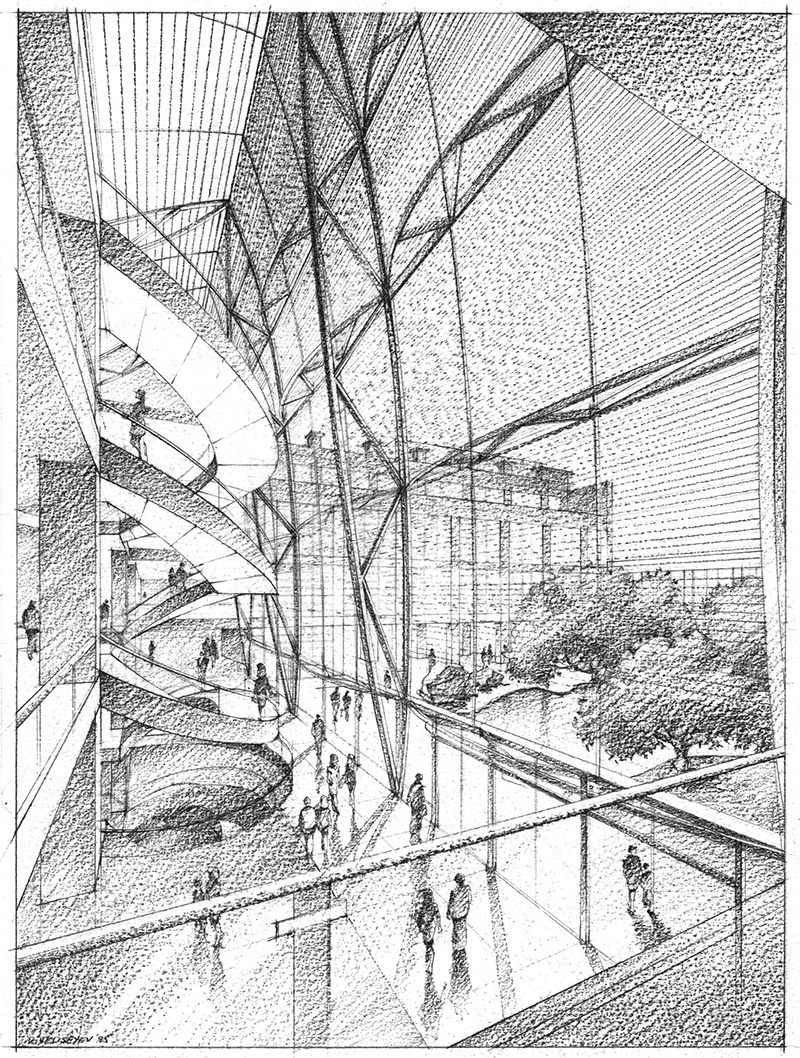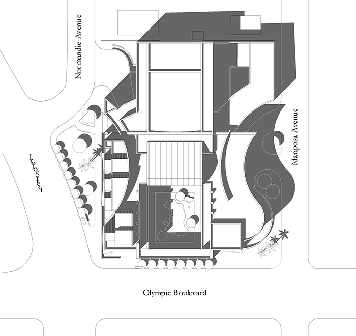 This design concept proposed in the 1994-1995 international design competition for the Korean American Museum of Art and Cultural Center is about Time: past, present and future. The awareness of the flow of time from the Future to the Present to the Past is central to a rich appreciation of human culture. The plan of the Museum and Cultural Center is based on a straightforward interpretation of one aspect of the traditional Korean yin-yang symbol, which represents the unity of opposites in the universe. Coincidentally, the symbol is similar to a Chinese character meaning “a stream of water.” The symbol is conceived as the essence and basis of this design. The design realizes this idea in the basic organization of forms and spaces. The activities and presentations within the building with the most profoundly temporal characteristics take place in the Garden, Auditorium, and Lecture Hall. Activities and presentations in these areas are deeply rooted in the confluence of Past and Future. The high atrium space creates a transition between the natural and manmade. These spaces are held in place by the opposing forms of the Permanent Exhibit Wing and the Temporary Exhibit Wing.