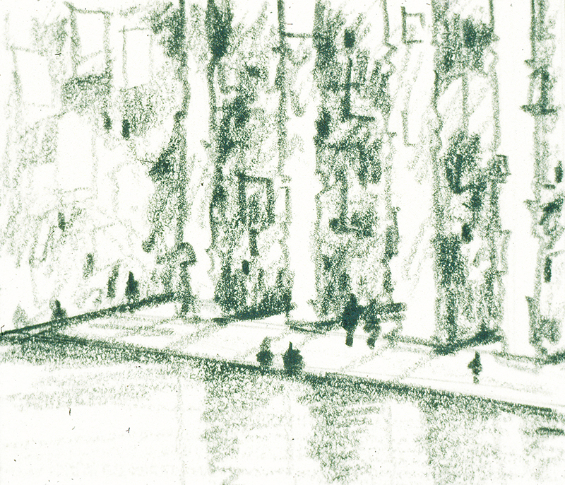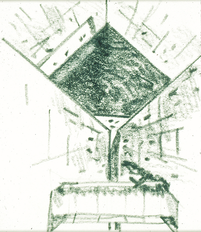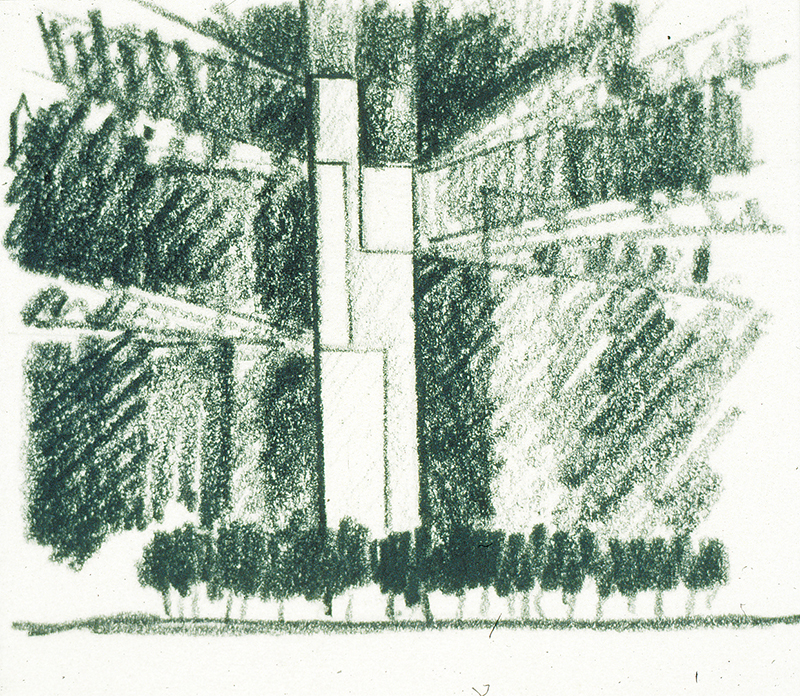 Evoking the city’s complex mosaic, interlocking stone plates form the massive walls of the tower. The plates create niches into which hundreds of thousands of small, multicolored caskets-holding the ashes of the interred and their life stories in digital memory- are randomly stacked. An open atrium soars 50 stories above a reflecting pool on ground level. Chapels, terraces, and rooftop cafe provide space for meditation and quiet conversation. As loved ones access the digital milestones of a lifetime, late twentieth century technology comes to terms with death.