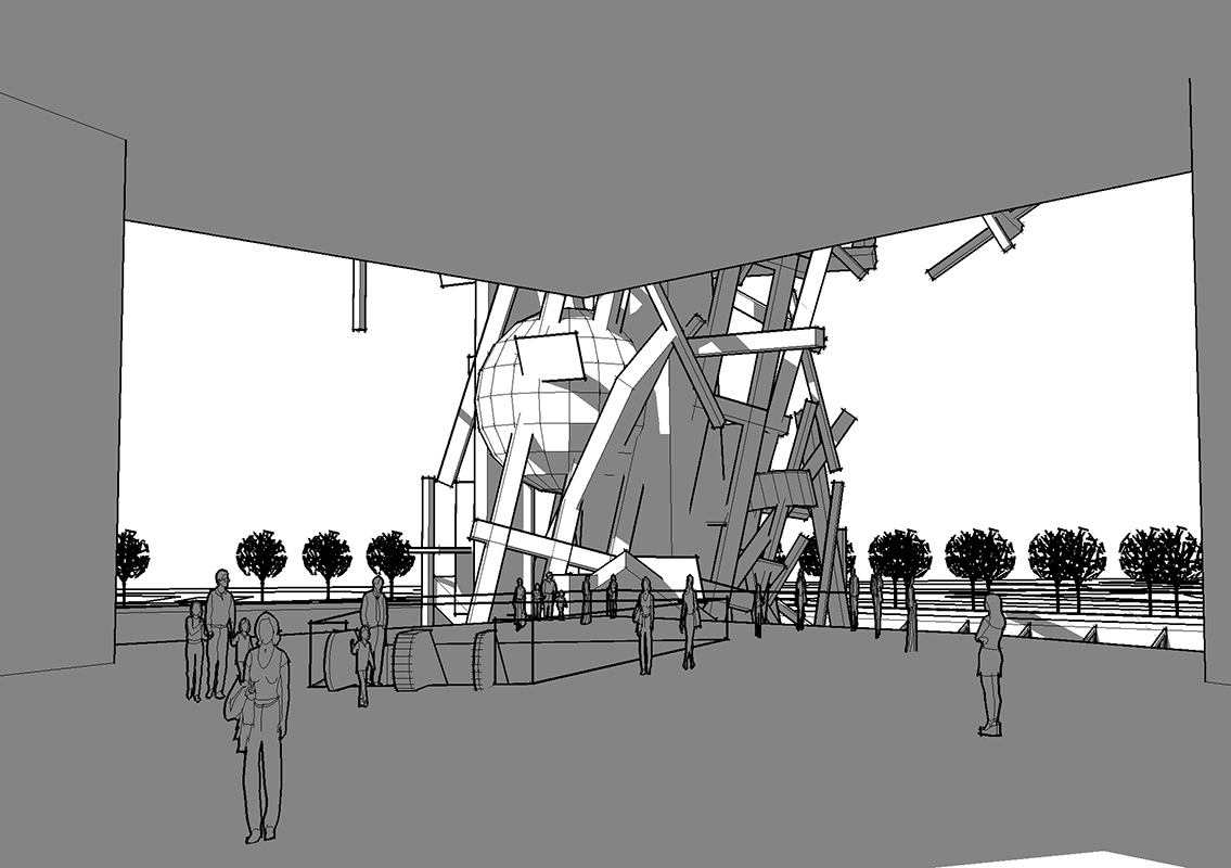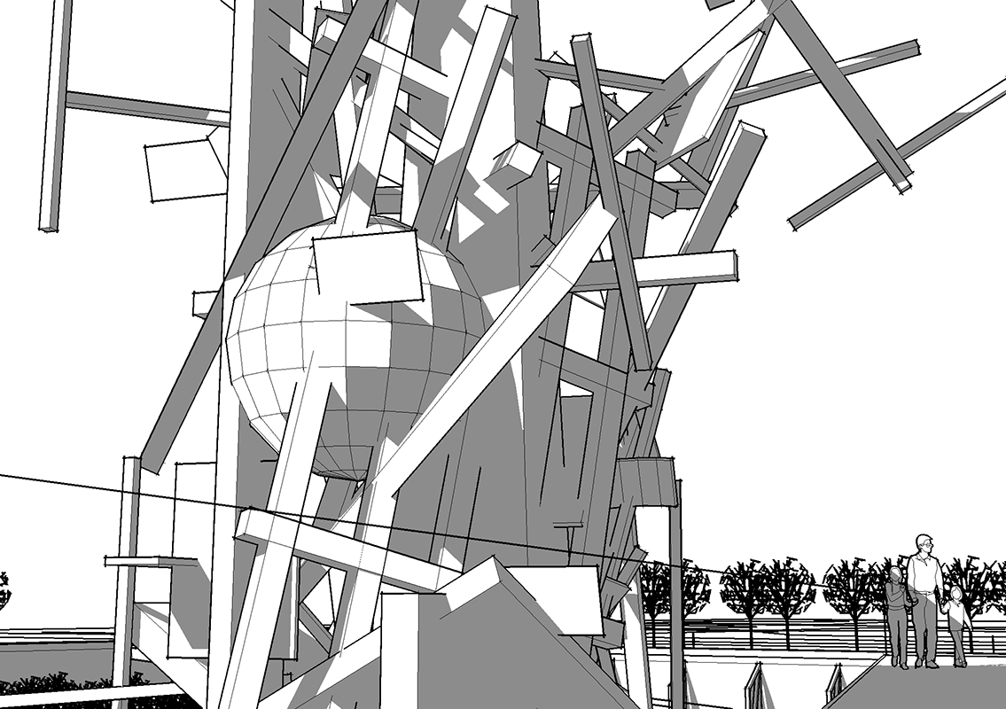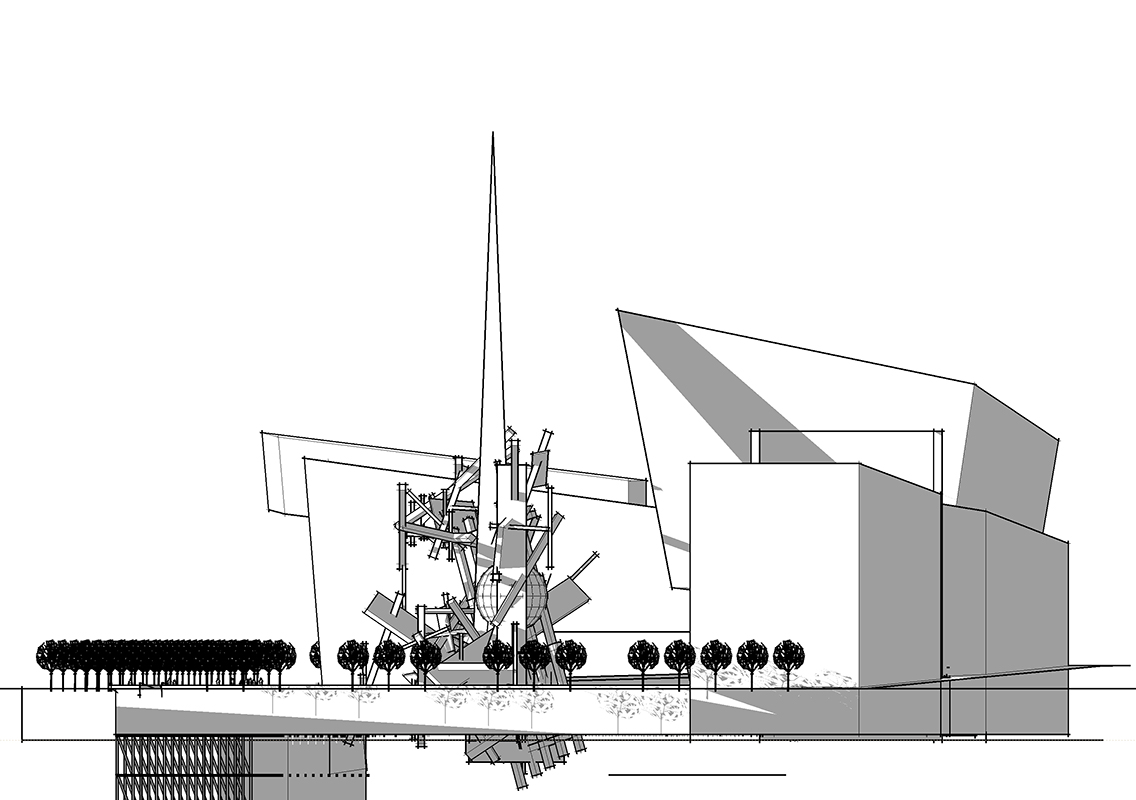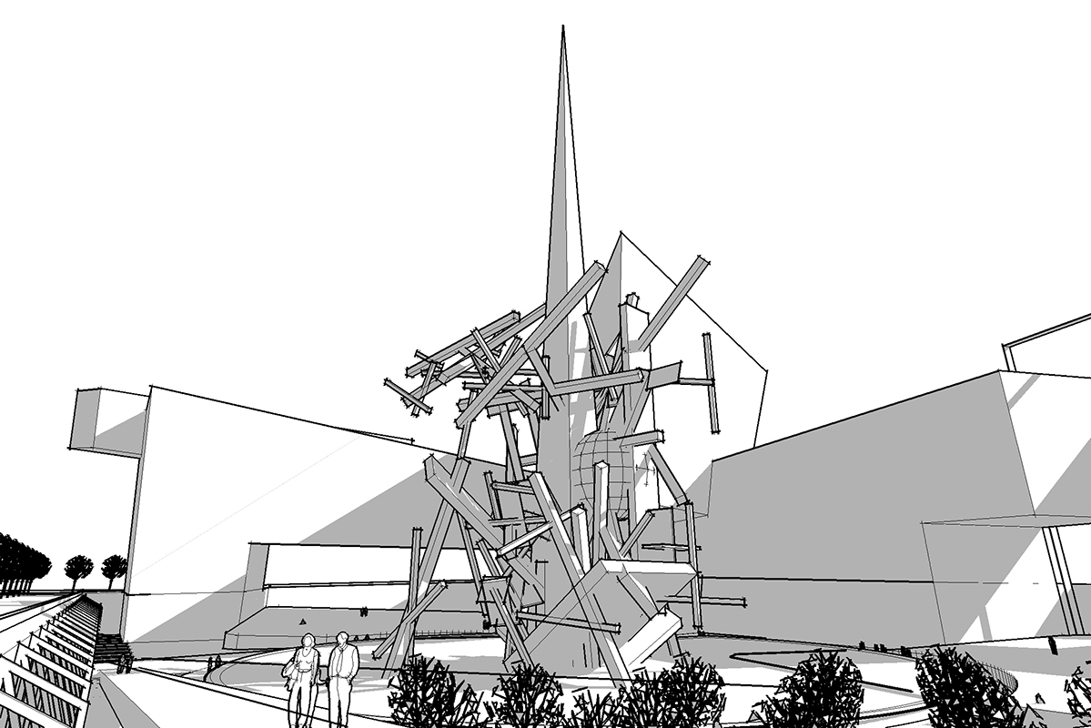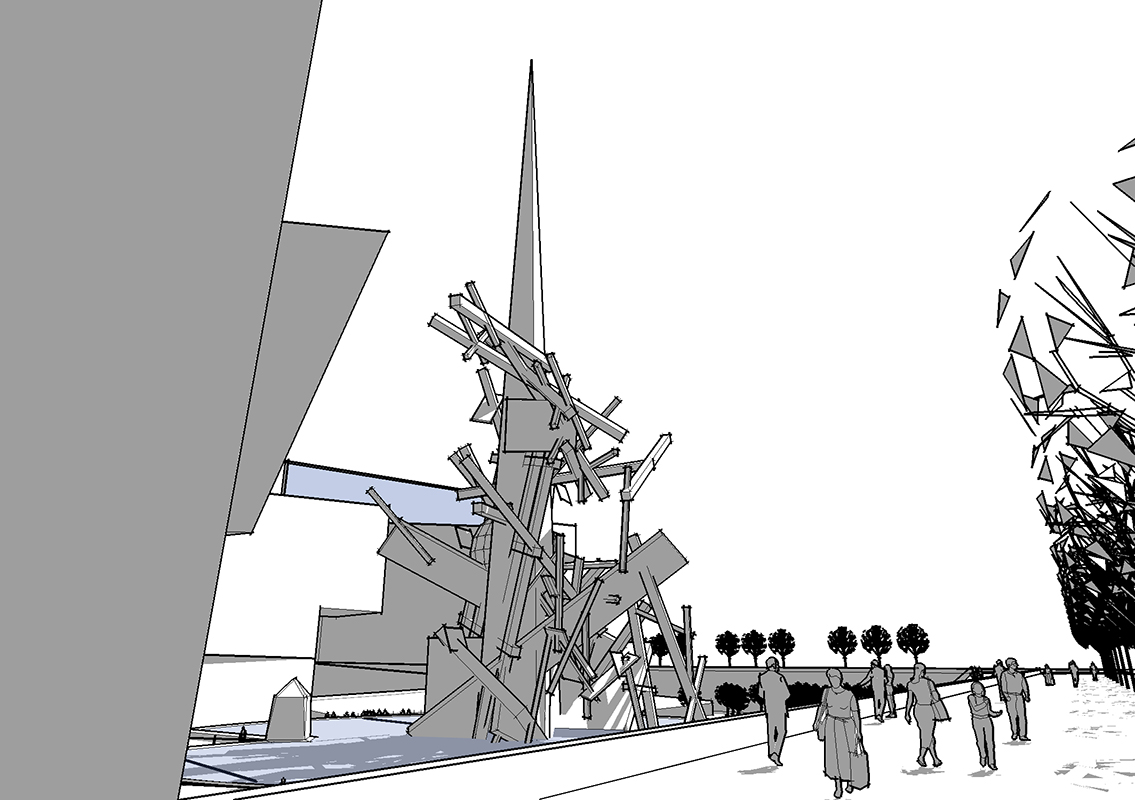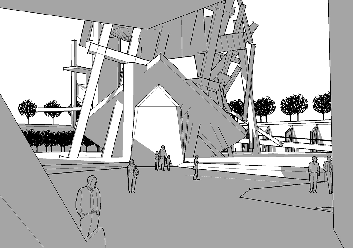The central structure of the memorial setting is an object, literally and figuratively. It represents our primal fears and horrors. It is a physical abstraction of Evil, imposing and irrational chaos modeled from the vague, elusive imagery and emotion of a child’s Night Terror. Its dynamics, materials and scale are meant to literally recall the violence of September 11, 2001. Pieces of the former towers may be incorporated within it. The object is our fear and personal terror. Around the edge of the reflecting pool, our object always looms high and in front of us, appearing different to each viewer, depending on one’s perspective, daylight, darkness and season of the year. Here, the terrible object is safely contained out in the water while remaining prominent in our presence. Joining us along the low circular stone wall edge are the engraved names of the 3022 people who lost their lives here, at the Pentagon and in Pennsylvania countryside. One might admit that the object tempts our curiosity, draws and keeps our attention. Even beyond the memorial site itself, the object is a prominent urban landmark, a full member of the city’s context. One may see a certain horrible beauty in it, like the awful images of the infamous September day. This is not meant to be a place of solace, but a place to remember the destruction and to recognize, confront and master our fears.